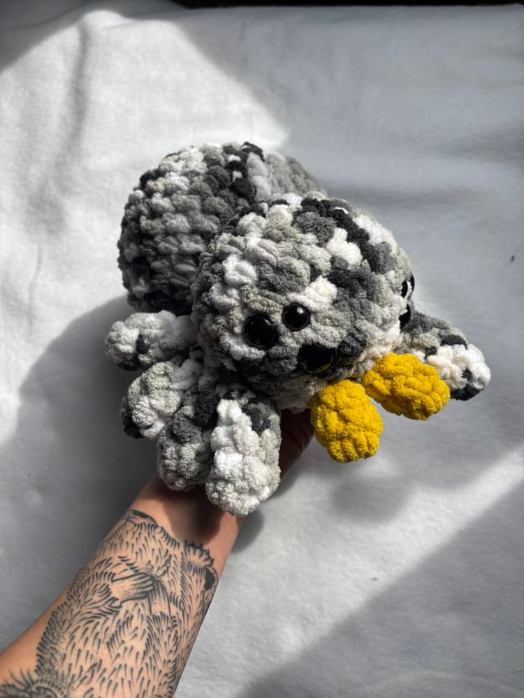 Made with super plush polyester blanket yarn, stuffed with Poly Fil and featuring (six) plastic safety eyes.